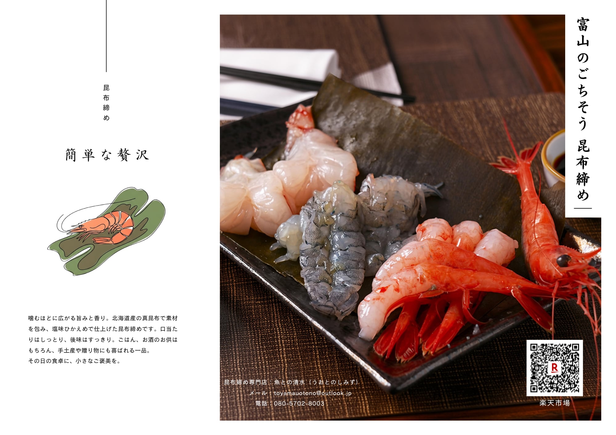 あまえび90g、赤海老5尾、天使の海老8尾 〇店主のおすすめの3種をまとめました。 『甘えび』昆布の旨味と甘えびの甘味がよく合います。当店一番人気 『赤海老』海老の中でも旨味が濃いです。昆布の旨味で上品に味わいに。店主が最もおすすめする商品です。 『天使の海老』海老の中でも高級とされている海老で、旨みと甘みのバランスが良いです。 ●甘えび(加国産又はその他)、昆布(北海道産)、おぼろ昆布(北海道産、醸造酢、ゼラチン)、味醂、酒/調味料(アミノ酸等)、(一部にえびを含む)●赤海老(アルゼンチン)、昆布(北海道産)、味醂、酒/調味料(アミノ酸等)、(一部にえびを含む)●天使の海老(ニューカレドニア)、昆布(北海道産)、味醂、酒/調味料(アミノ酸等)、(一部にえびを含む) 「熟成×熟成」 -昆布締めに締める前に、魚介を熟成させます。この段階で魚介の旨味を最大限に引き出します。 -昆布で締め(熟成)、旨味と塩味を魚介に移します。 「旨味、甘味、塩味」 -絶妙な味の調整をし、理想の味に仕上げます。