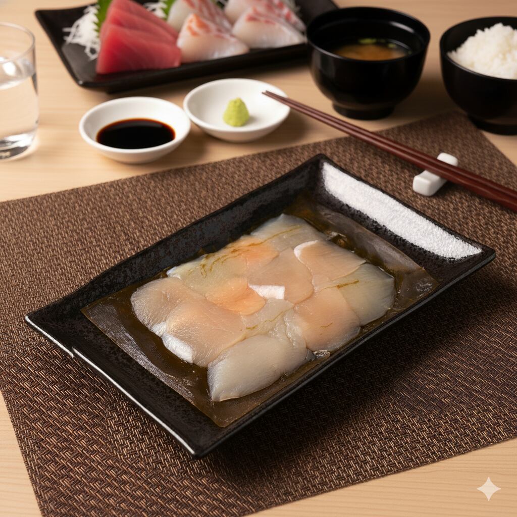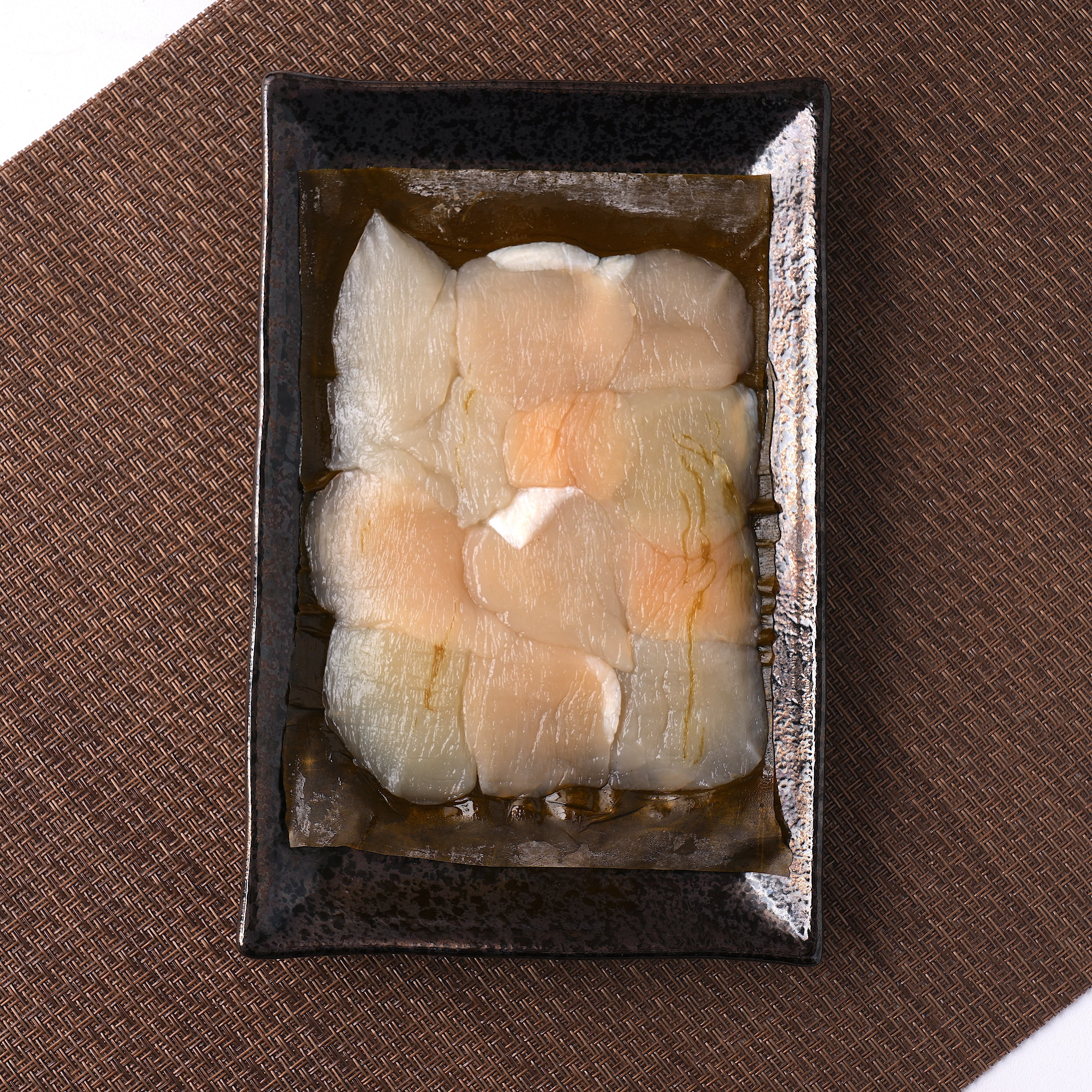 -昆布で締め(熟成)、旨味と塩味を魚介に移します。